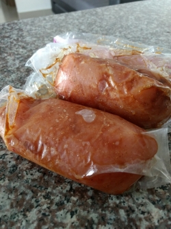 Begin by boiling the rice including two pieces of smashed garlic and then move on to seasoning the chicken breasts with olive oil, curry, cumin, garlic powder, Worcestershire sauce and barbeque sauce a then sealing them in either a vacuum bag or zip loc bag, using the water immersion technique. When the temperature is reached, let the chicken bathe for one hour.