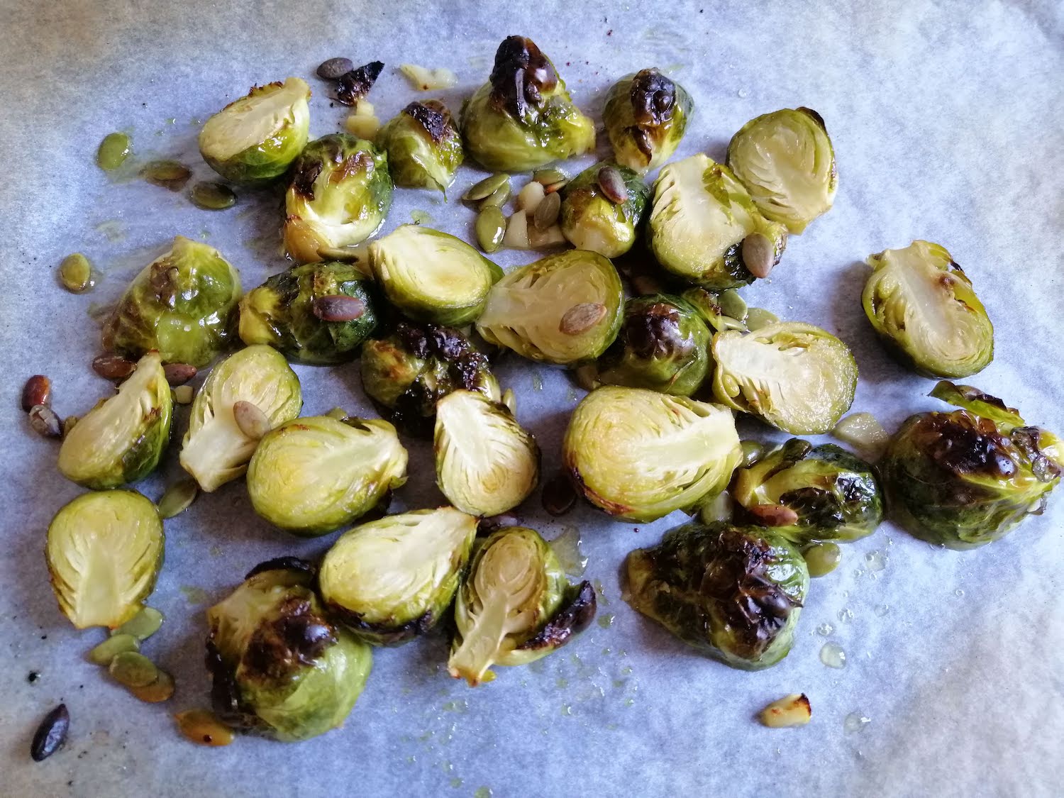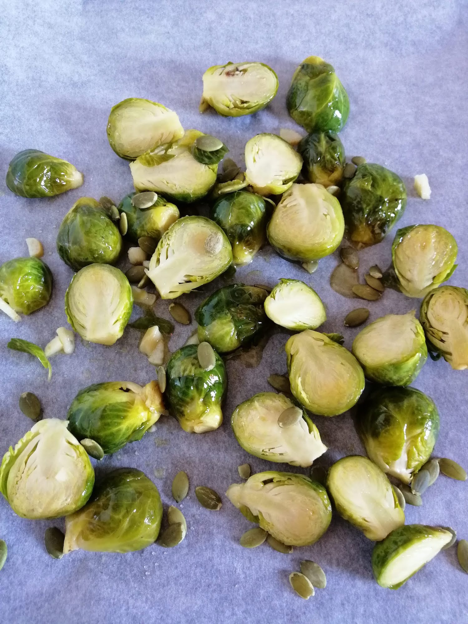 Sortez du bain, mettez sur une plaque de cuisson et ajoutez un mélange d'huile d'olive et de miel puis les graines de courge.