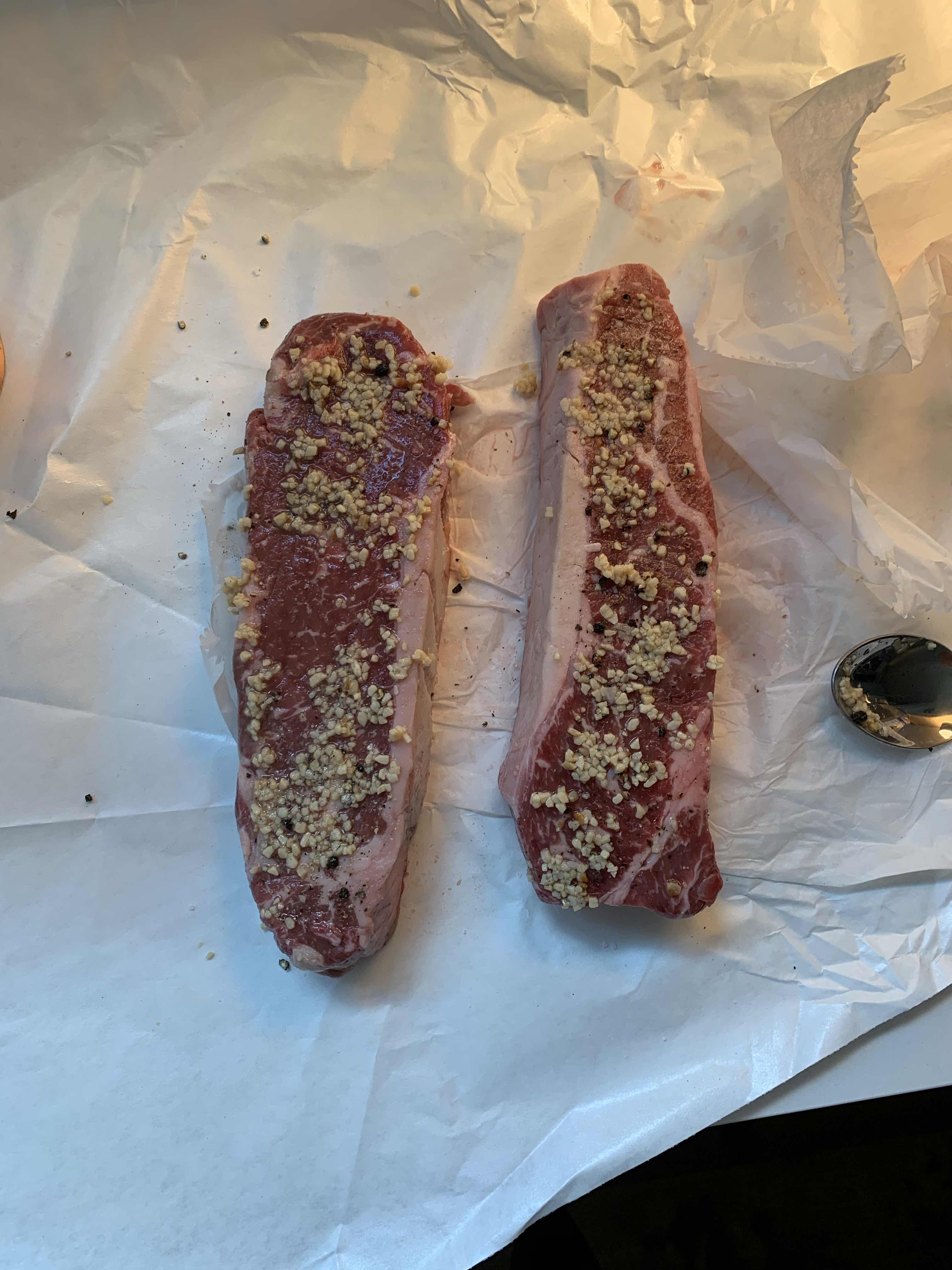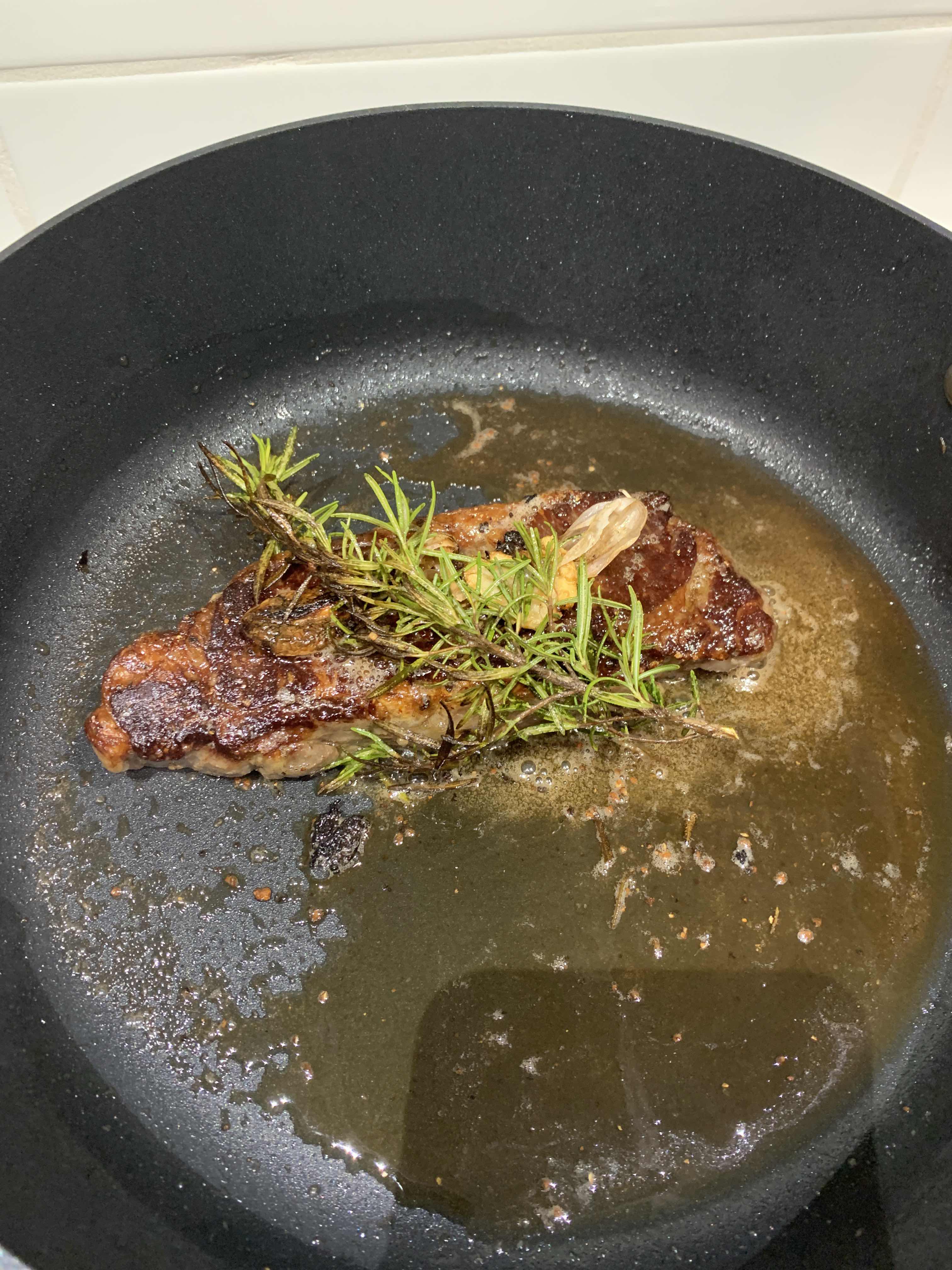 Heat pan medium high with neutral oil like grape seed. Season steaks with salt and pepper (a lot of this will cook off during searing this is why you season again) Sear with aromatics (rosemary or thyme) garlic (smashed). When it’s smoking place steak in the pan (high pans help with splatter) sear 45 seconds and then place garlic, rosemary or thyme with tablespoon of butter. Let sear 15 more seconds, flip, then sear 1 minute while basting with a spoon over top. Tilt the pan to get juices in a position to spoon over. Tilt pan to sear side of cap fat for 30 seconds. Pull off heat and put on plate or board to rest for 5 mins