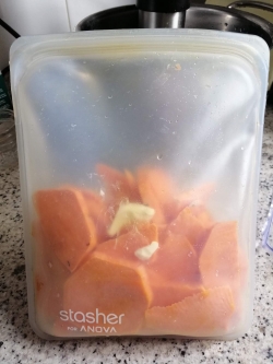 Coupez la patate douce en tranches et mettez-la sous vide avec le beurre. Faites cuire pendant 2h00 à la température indiquée.