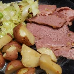 Tender and perfectly spiced beef brisket. Serve with side of cabbage and red potatoes cooked in the juices from the brisket. If your brisket weighs over 7lb, please add 2 hrs.