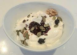 Picture shows A2 Greek yogurt finished with vanilla paste, mixed berry puree, and granola containing pumpkin seeds, dried blueberries, walnuts, coconut, and cocoa nibs. Delicious!