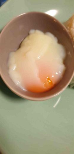 Egg white is soft, not runny. The yolk is gooey. Perfect for my liking. I cook at least 6 eggs or more eggs at a time. I put them in the fridge and warm them up using exactly the same temperature setting. Put cold eggs in the water bath from the beginning. But the time the water reach the temperature, which only take about 10 minutes or less. The cold eggs are warm up with the same texture. Ready to serve.