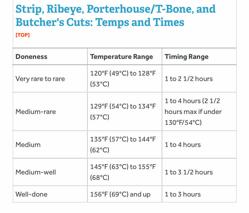 Strip, Ribeye, Porterhouse/T-Bone, and Butcher's Cuts: Temps and Times [TOP] Doneness Temperature Range Timing Range Very rare to rare 120°F (49°C) to 128°F (53°C) 1 to 2 1/2 hours Medium-rare 129°F (54°C) to 134°F (57°C) 1 to 4 hours (2 1/2 hours max if under 130°F/54°C)