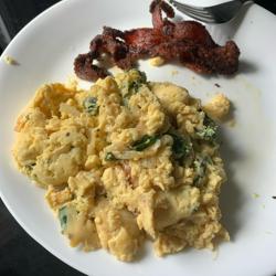 - Whip eggs, milk & seasoning in a bowl. Pour into gallon freezer bag. Cook onions in skillet for about 10 min. Once translucent add spinach and cook for another minute. Add onions/spinach and cheese to bag of eggs. Place bag in water (keep top open and clamp to the side to push air up). Take out every 5-7 min and mix so the eggs cook evenly.