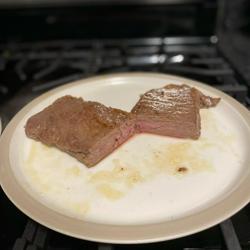 Strip steak cooked medium and seared in a piping hot cast iron skillet.