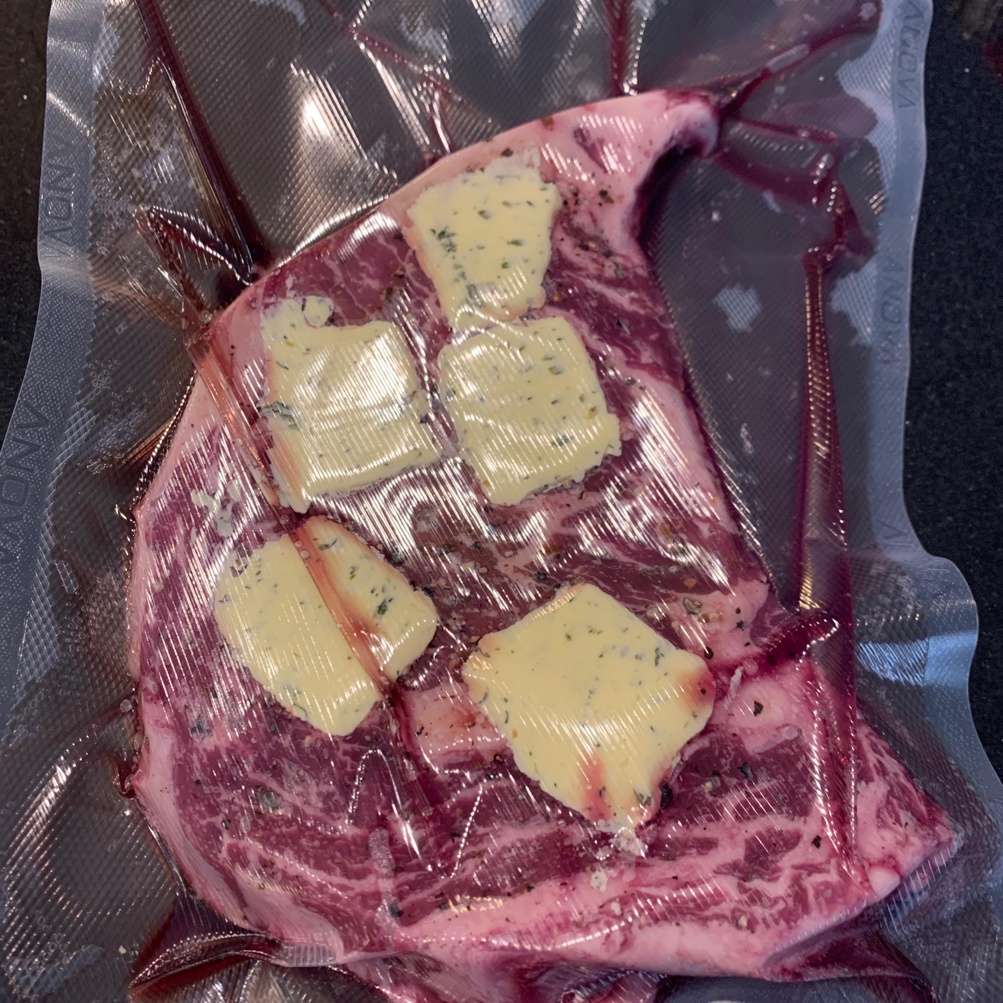 Place steaks in vacuum bags and cut thin slices of butter to place on steaks