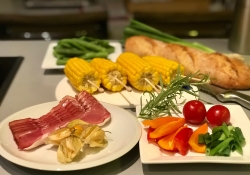 30 min vor Ende der Garzeit das Gemüse säubern, Maiskolben schälen und ca. 15 min in Sakwasser nicht zu weich kochen, halbieren und Zahnstoccher o.ä. in die Schnittseite stecken, Paprika und Frühlingszwiebeln in grobe Stücke schneiden.