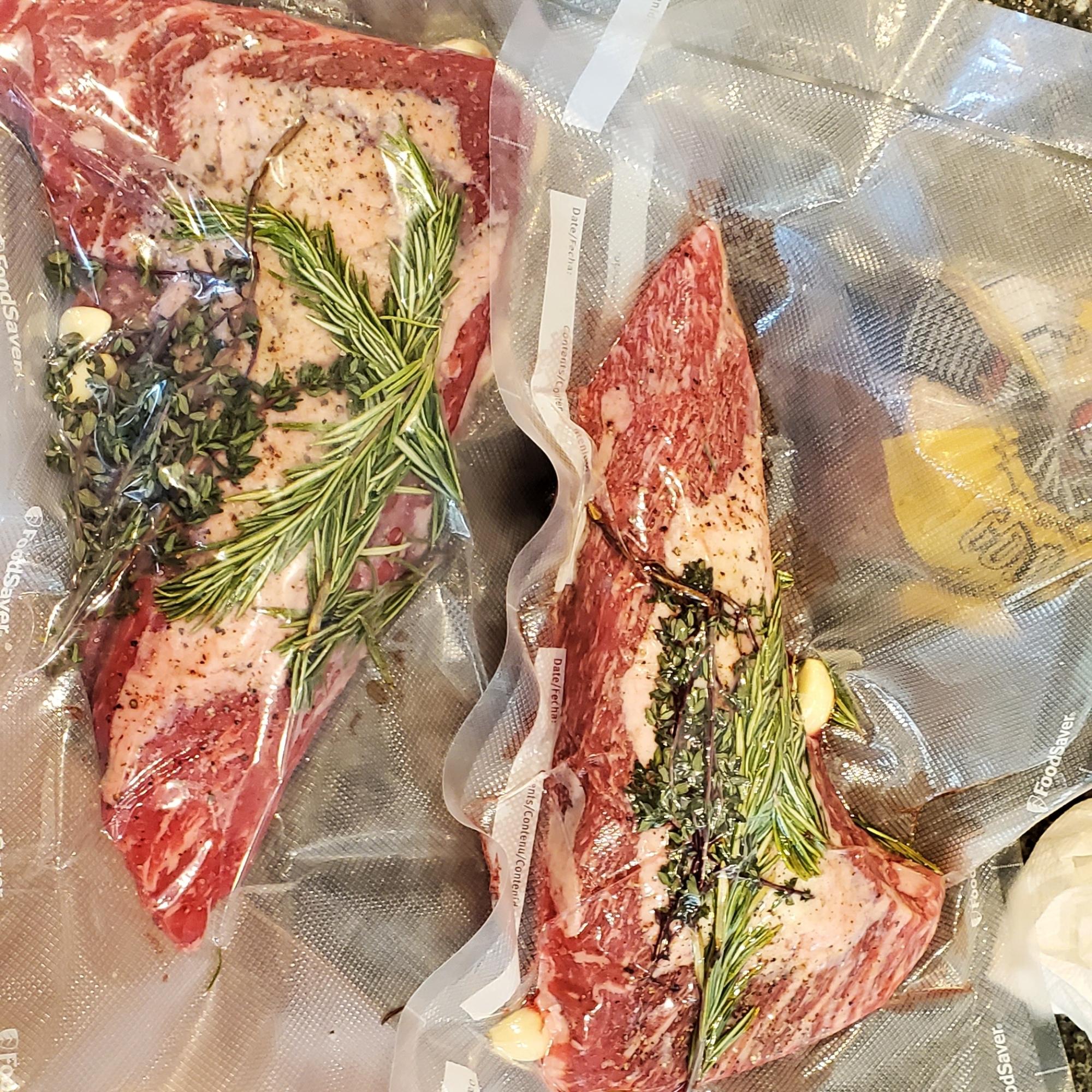 Salt and pepper all sides of the tri-tip. Place 5-6 cloves of garlic, 2-3 sprigs of rosemary and thyme into the bag. Pre-heat to 131F and cook for 24 hours