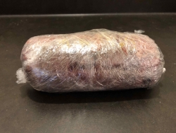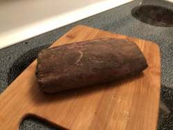 Roll puff pastry into a thin square, approx 16"x16". Place pastry on top of a layer of saran wrap. Remove beef from freezer, and remove saran wrap carefully.