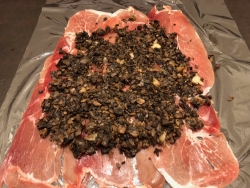 Remove beef from fridge, coat all sides with spicy mustard. Place beef on top of duxelles and prosciutto.