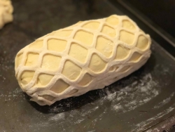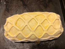 Remove beef from freezer, and unwrap saran wrap carefully. OPTIONAL: Using a lattice pastry cutter, cut a strip of pastry as long as your beef, and drape over the existing pastry for a fun design.