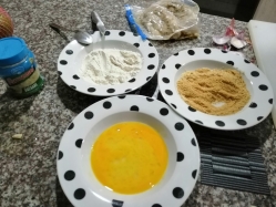 Prepare the breading assembly line shortly before the end of the cooking time: 1) Mix the flour with salt and pepper; 2) The beaten whisked egg; 3) breadcrumbs, parmesan and parsley. After the chicken is done, take it out of the bag and dry it well, then let it pass the breading assembly line.
