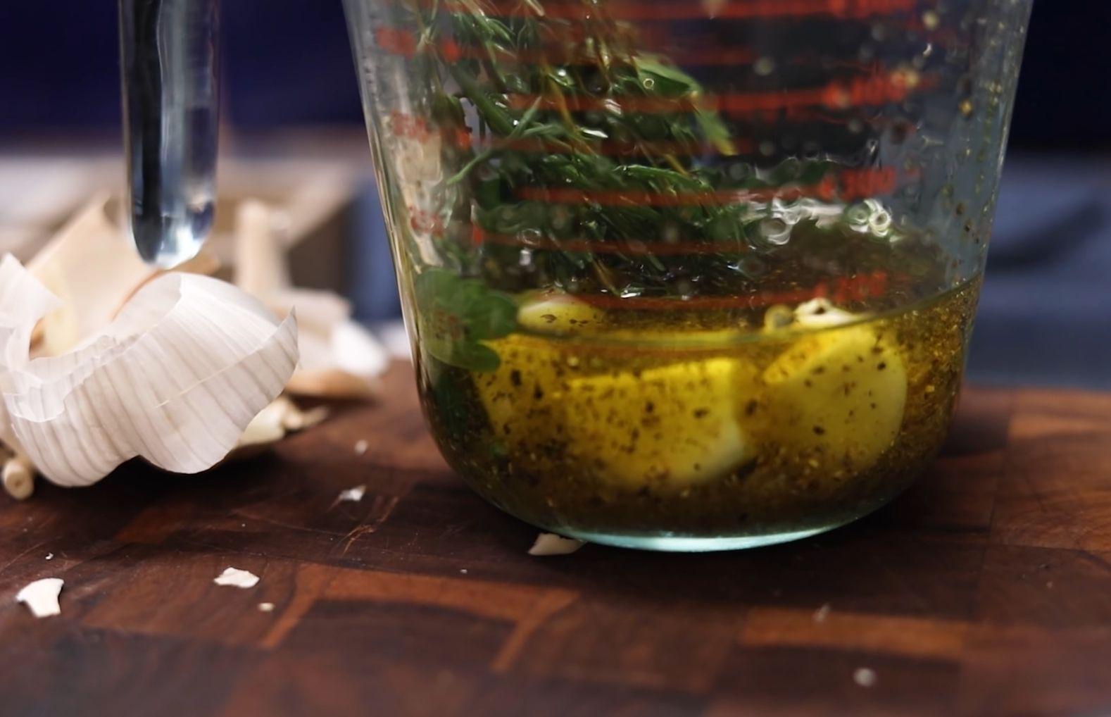 Make the marinade. Don't blend, just mix the olive oil, salt, pepper, garlic cloves, thyme, parsley, and dill.