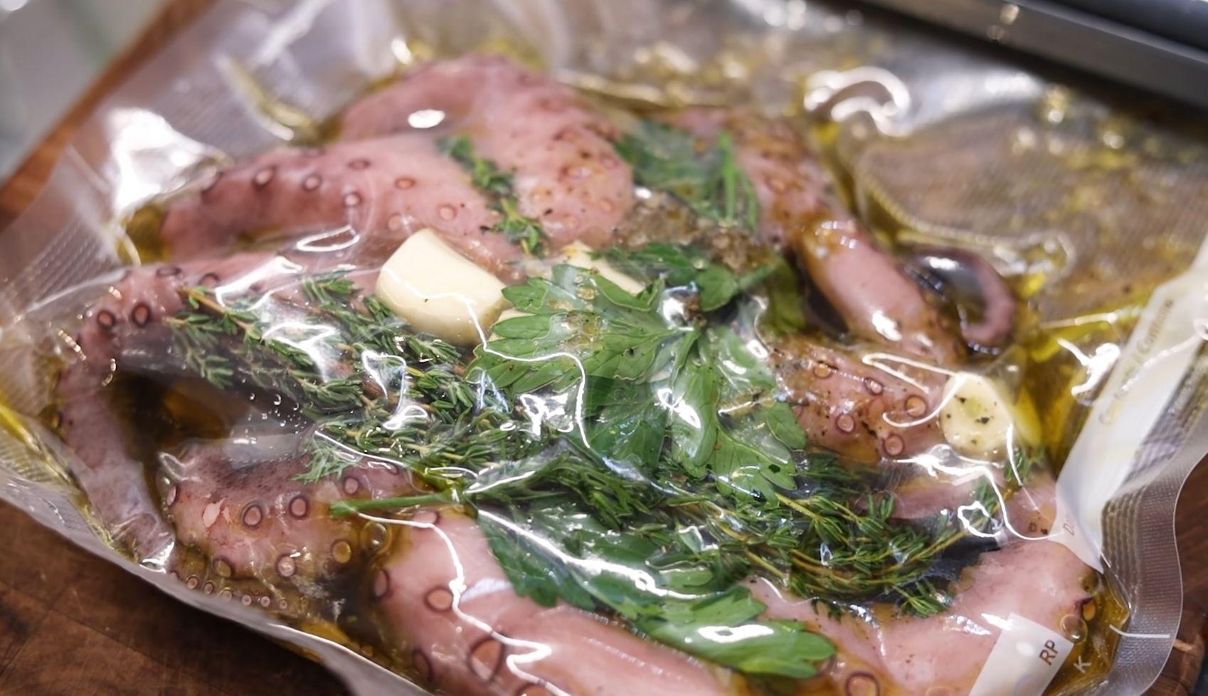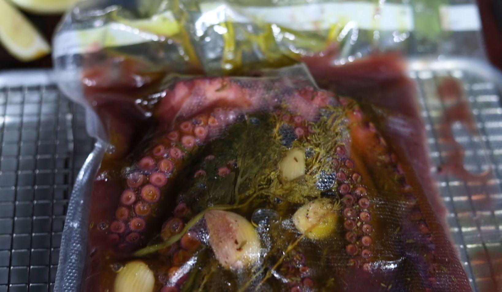 Place the octopus and marinade in a vacuum bag, and cook for 6 hours at 77.2 °C.
