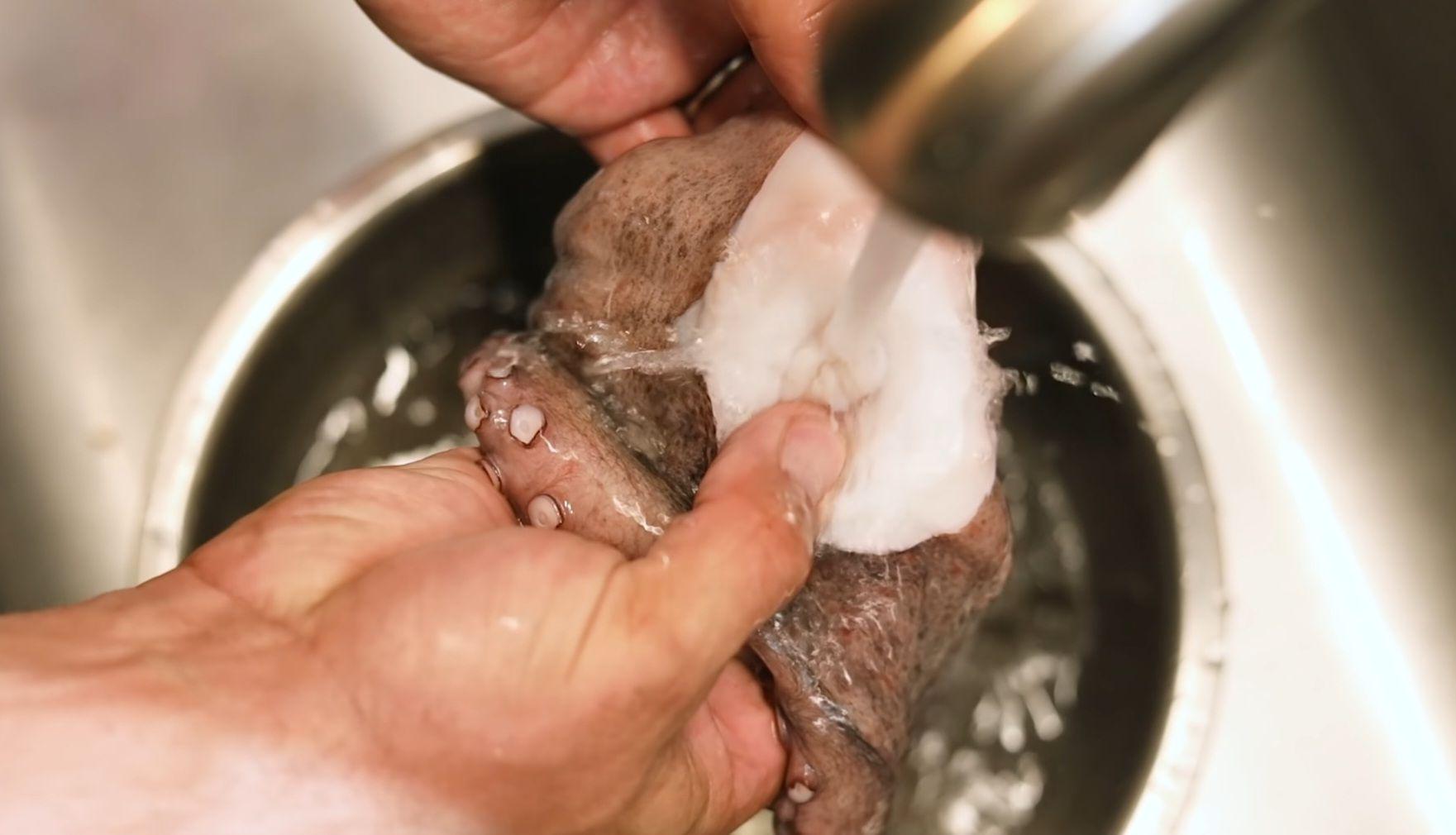 Wash the octopus thoroughly, then cut off the head right below the eyes. Remove the beak. Wash the tenticles once more.