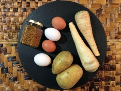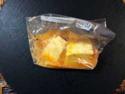 Add the potato and parsnip to a heavy duty bag along with salt, olive oil, and some veg stock.
