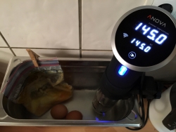 Remove the air from the bag and place in the water bath along with the two medium eggs. Make sure to clip the bag to the edge so it doesn't disrupt your eggs. Set the timer for 45 minutes.