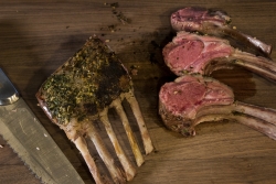 Remove rack of lamb from vacuum bag and sear on both sides with a hot pan.