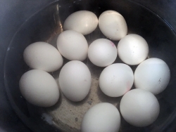 Get a large stock pot with water up to a boil and gently lay your eggs into the water.