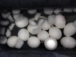 After an hour, remove the eggs and begin the process of gingerly peeling all 12. Don't forget to reset your Anova Precision Cooker to 195F/90.5C.