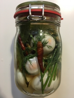 Layer the eggs into a jar with the fresh herbs. Pour the brine over the top. *The jar is 1l / 1 qt. canister jar with a hinged lid. You can use a screw top or even bag if you want.