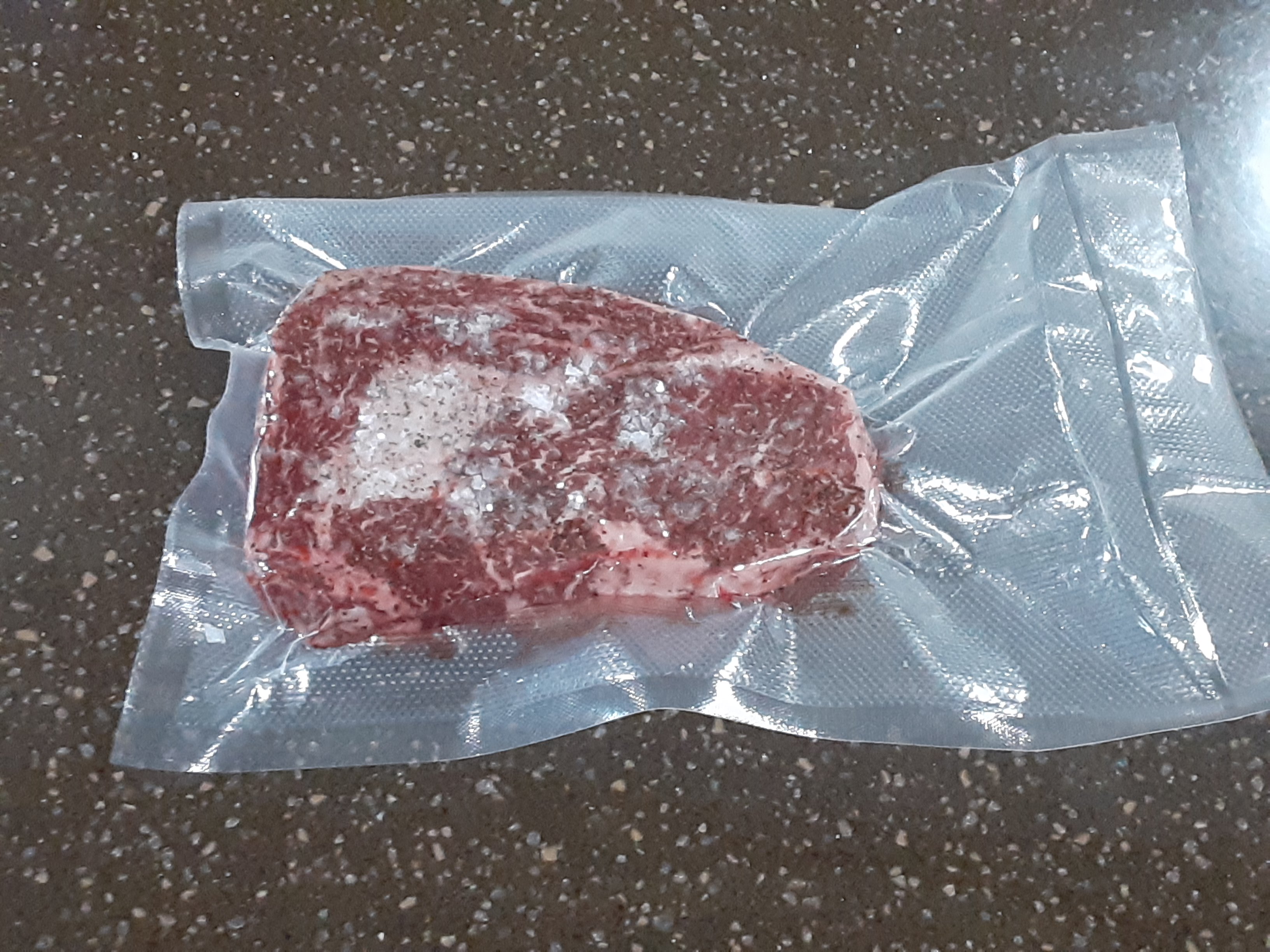 Season the steak with salt and pepper and place in a vacuum bag and seal. Add to water bath.